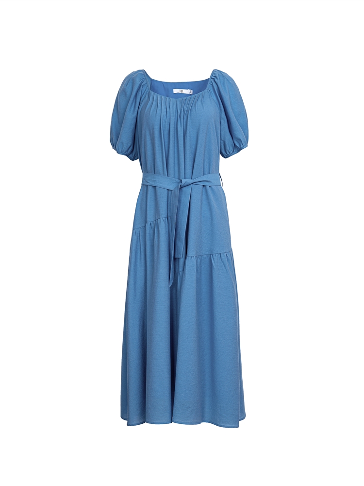 HR赫莲娜薄款牛仔连衣裙女夏季方领泡泡袖显瘦腰带气质荷叶边长裙