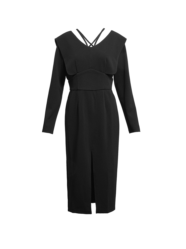 HR赫莲娜V领显瘦黑色连衣裙子女2024新款小个子高级感长裙法式
